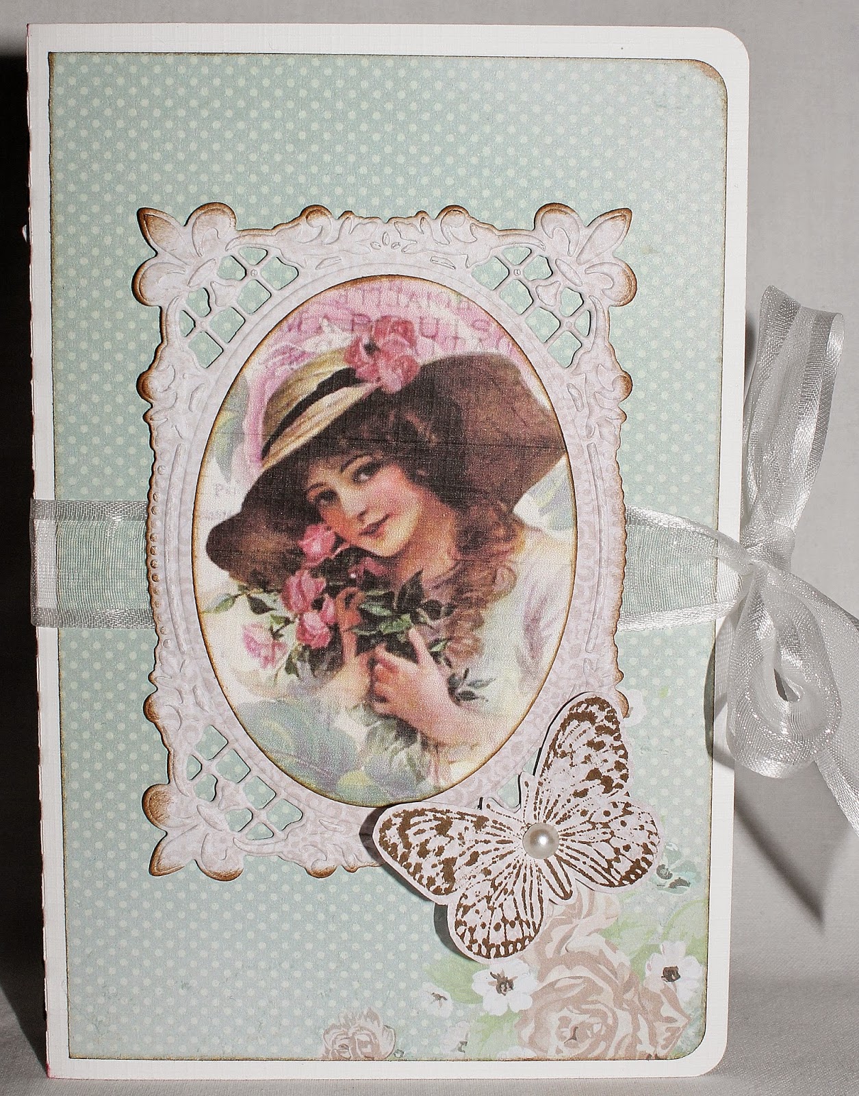 Dat was boffen dat ik met dit mooie papierblok van Joy!Crafts aan de slag mocht. Het bestaat uit mooie zachte tinten groen en roze papier. Toen ik deze afbeelding op Pinterest tegen kwam was dat voor mij precies dat plaatje wat erbij hoorde. Ik heb een soort boekje gemaakt met onder het dekseltje lekkere chocolade verpakt. De mooie stempels van Scrapberry’s heb ik met Distress Inkt gestempeld op het roze dessinpapier. Aan de binnenzijde heb ik de rozenrand gebruikt en ook een paar roosjes hiervan los geknipt en op de zijkant geplakt. Zo kun je deze mal op verschillende manieren gebruiken.